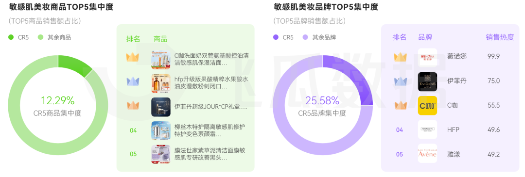 在敏感肌美妝市場中,CR5品牌集中度為 25.58%,意味着頭部品牌雖有一定集聚效應,但整體市場仍較為分散,眾多品牌與產品競爭激烈,市場格局尚不穩定。