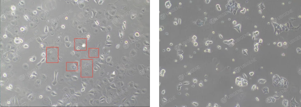細胞生長狀態差圖片:細胞形態異常,如細胞體積變大,扁平化(如下圖紅框框起來處),細胞可能變得不規則,失去典型的鋪路石樣外觀,出現空泡化等。