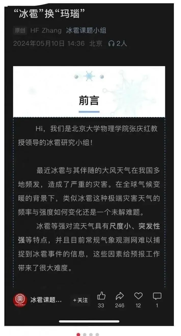 自2021年起,北京大學物理學院張慶紅教授課題組發起了“冰雹換瑪瑙”的長期活動,邀請公眾通過收集冰雹,參與科學研究活動,每一位公眾的參與都可以幫助科學家理解冰雹在雲內的增長機制,進而幫助提高冰雹的預報水平,減少國家和民眾的經濟損失。