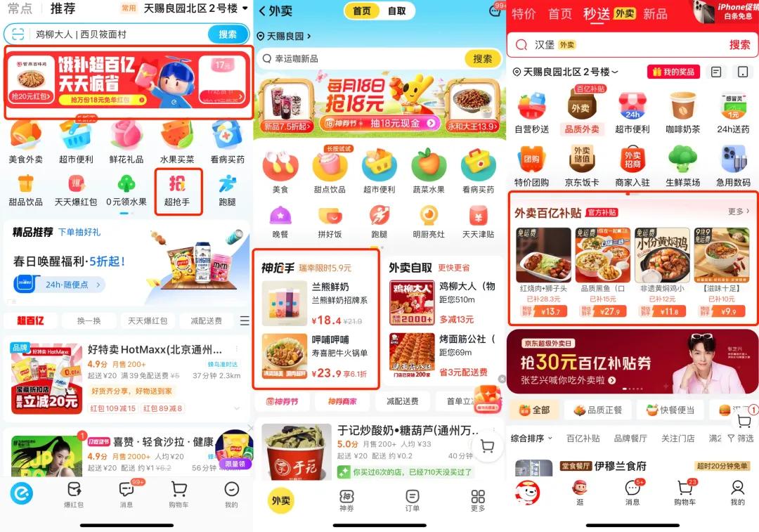美團在保留"神槍手專區"傳統入口的同時,新增"秒選外賣"列表,配合"大牌低價"的紅色標籤,形成了更強的視覺刺激。在搜索頁面,美團還將諸如“黑金神券包”、“瑞幸9.9”等詞條放在搜索發現中,吸引有明確搜索需求的用户關注活動。餓了麼的"超搶手專區"主打限時三折,“天天爆紅包"即時顯示可減金額,再疊加“5折天”、“節日專享”等動態標籤,優惠信息也可以説是層層滲透。