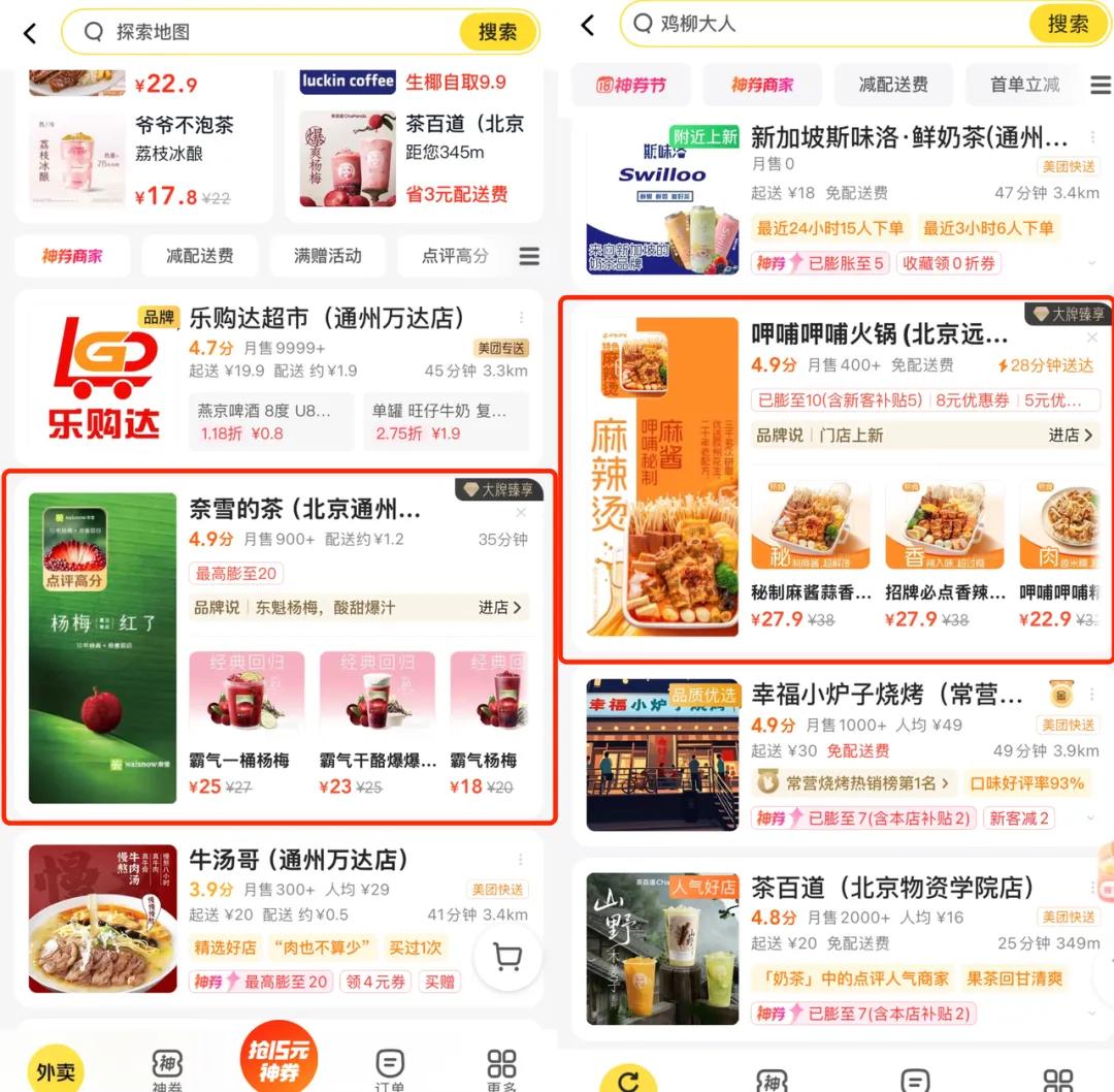 但這只是常規操作,**商家常態化投入,能保持效果但不會帶來太多增長驚喜。所以平台現在開始為連鎖品牌打造更多有“特權感”的資源。**比如美團上被連鎖品牌“承包”的廣告呈現形式——大牌臻享,固定在列表第二位,展示面積更大,還突出展示了主推商品、高分店鋪、品質認證等標識。
