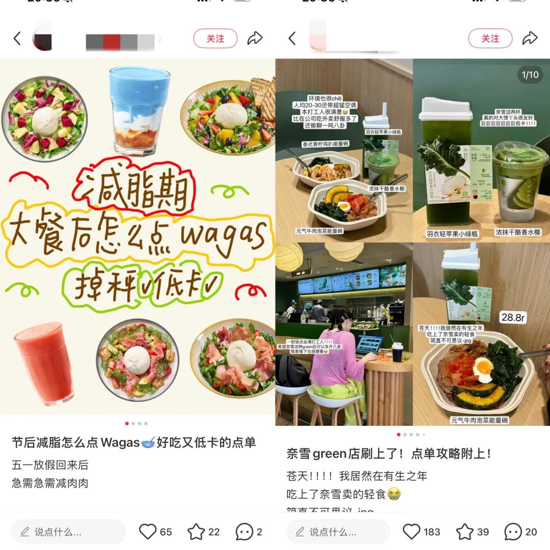 很多餐飲品牌也是通過減脂減重等內容展開營銷,通過持續和營養師和健身博主合作,在目標人羣中可以建立"減脂首選"的認知,復購率顯著提高。比如在小紅書搜索“減脂外賣”,就能刷到奈雪的茶、wagas、賽百味、袁記雲餃等不少連鎖品牌的推廣內容。