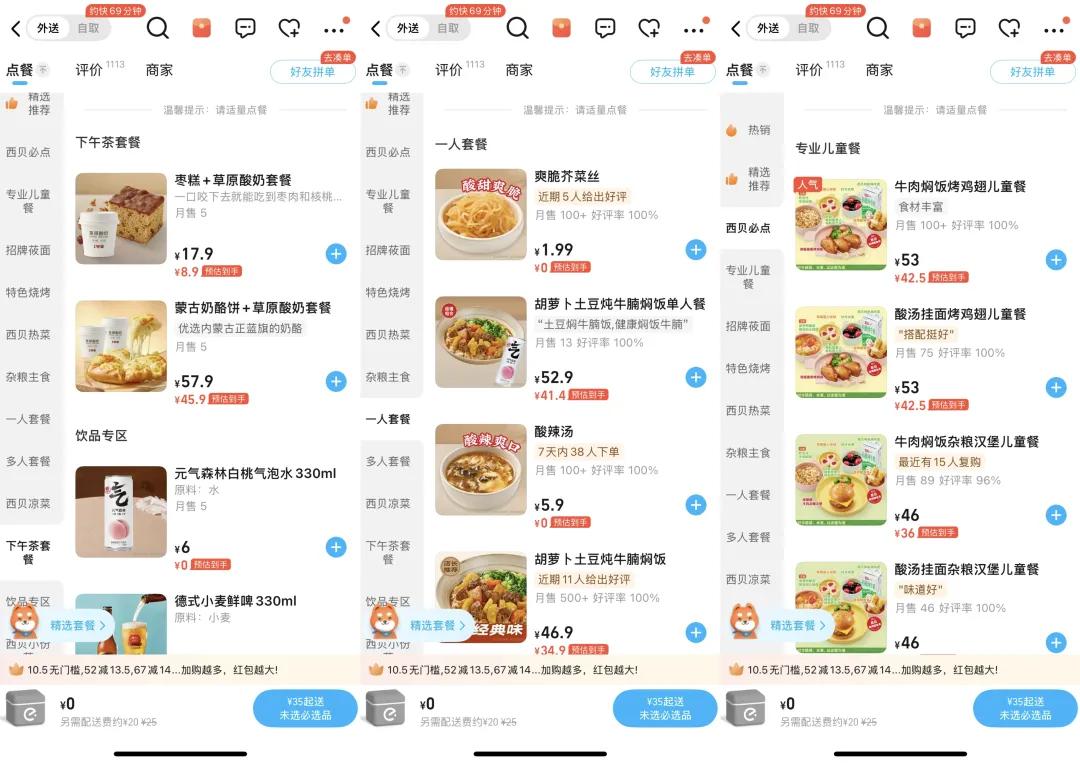 比如西貝莜麪村,是將線下受歡迎的招牌菜如西貝麪筋、土豆胡蘿蔔牛腩等針對外賣場景重新設計為一人食套餐,另外還有兒童餐、下午茶套餐等等。這種基於場景的產品設計,既保留了品牌特色菜品,也方便了用户。