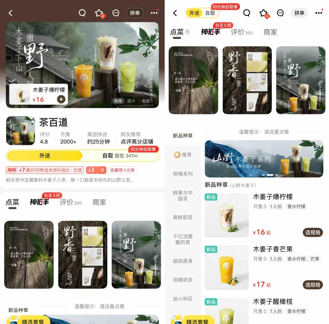 從logo設計到頁面佈局,品牌的所有門店都保持着高度一致的視覺體系,才會讓用户一眼就能識別出品牌的定位和品牌調性。同時,品牌還會充分利用各種能夠呈現圖片的位置,在日常直接突出“收藏門店領取福利”的字樣,巧妙引導用户收藏門店,增強用户粘性;還可以在新品上市時,整體更換相關海報去推廣。比如近期茶百道在推廣木姜子系列新品,就更新了所有門店的視覺呈現,店鋪首頁也有新品海報,形成了很強的記憶點。
