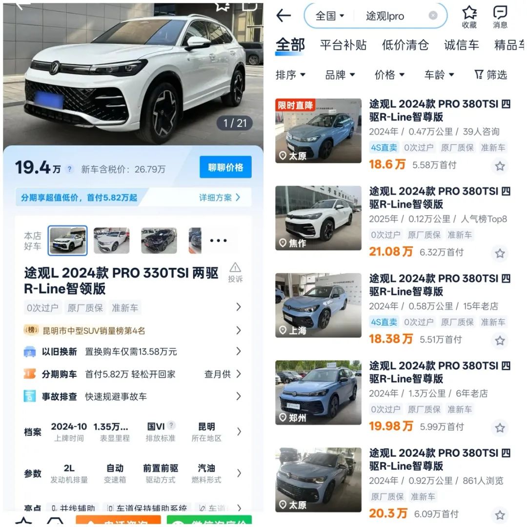 據源Auto從廣州本地二手車市場以及二手車之家等平台上梳理,1年車齡、行駛里程2萬公里內的途觀L Pro,價格普遍在18萬-20萬之間,根據不同車型的指導價折算,保值率為70%-80%。
