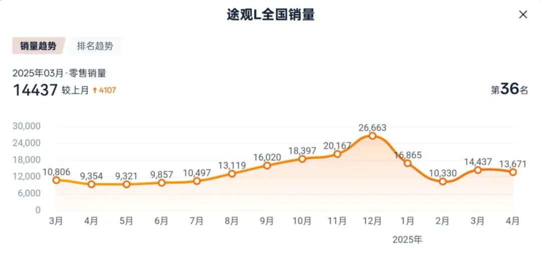 這些銷量中,保值回購政策具體帶動了多少難以細分,但一個事實是,踏入2025年至今,途觀家族銷量有所下滑。今年4月,包括途觀L Pro和途觀L 出眾款兩款車型的途觀L家族銷量為1.36萬輛。