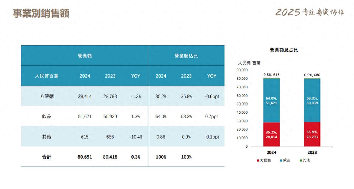 從企業角度看,以康師傅為例,2024年,康師傅來自方便麪業務的營業額為284.14億元,同比下滑1.3%,在總營業額中的佔比,也從2023年的35.8%下滑到35.2%。同時,2023年,康師傅方便麪產品的生產線有166條,2024年減少到了158條。