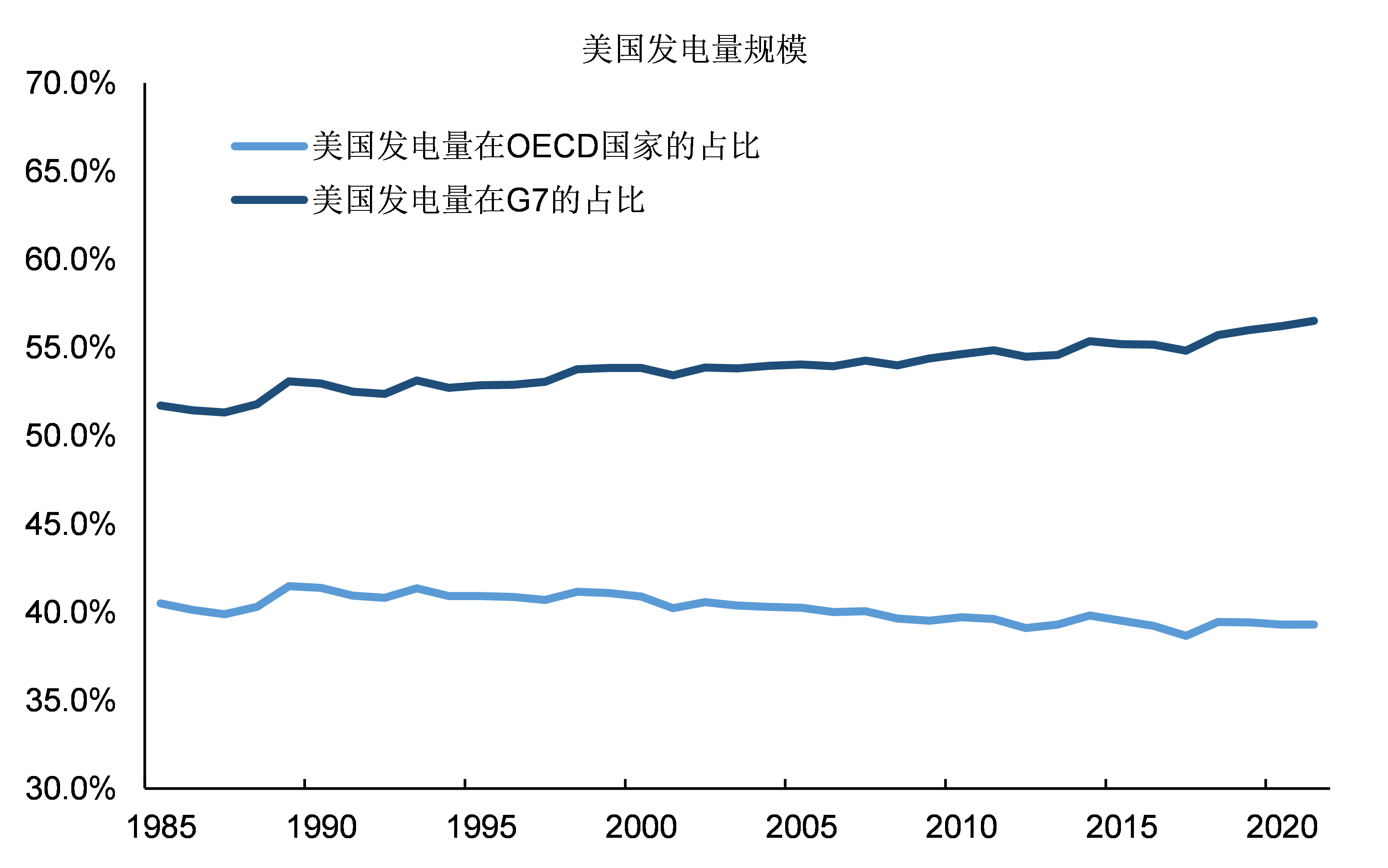 在七國集團中,美國發電量的佔比從2000年的53.8%提升至2020年的56.2%。