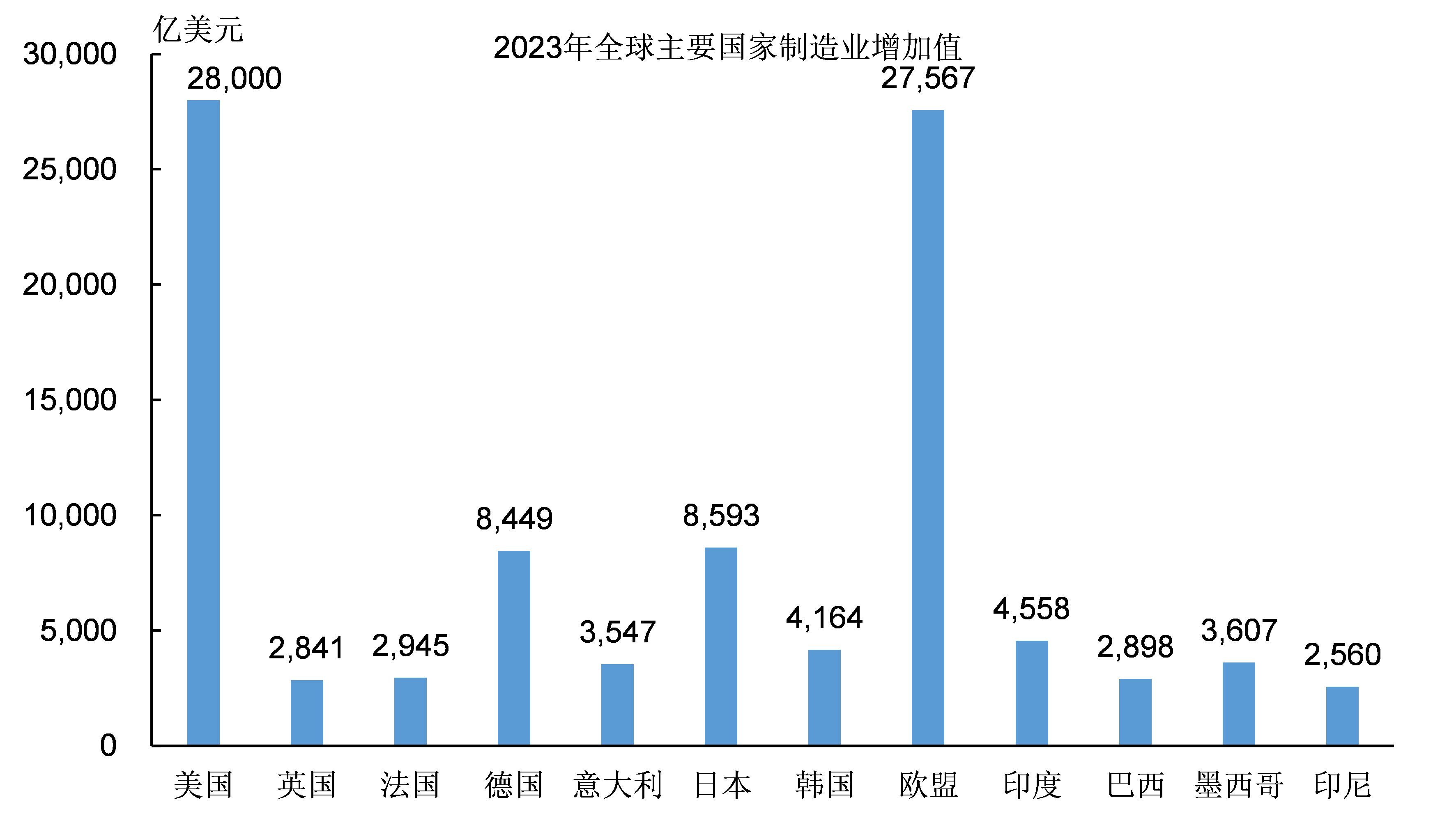 2023年美國製造業增加值是2.8萬億美元,規模僅次於中國位居全球第二。