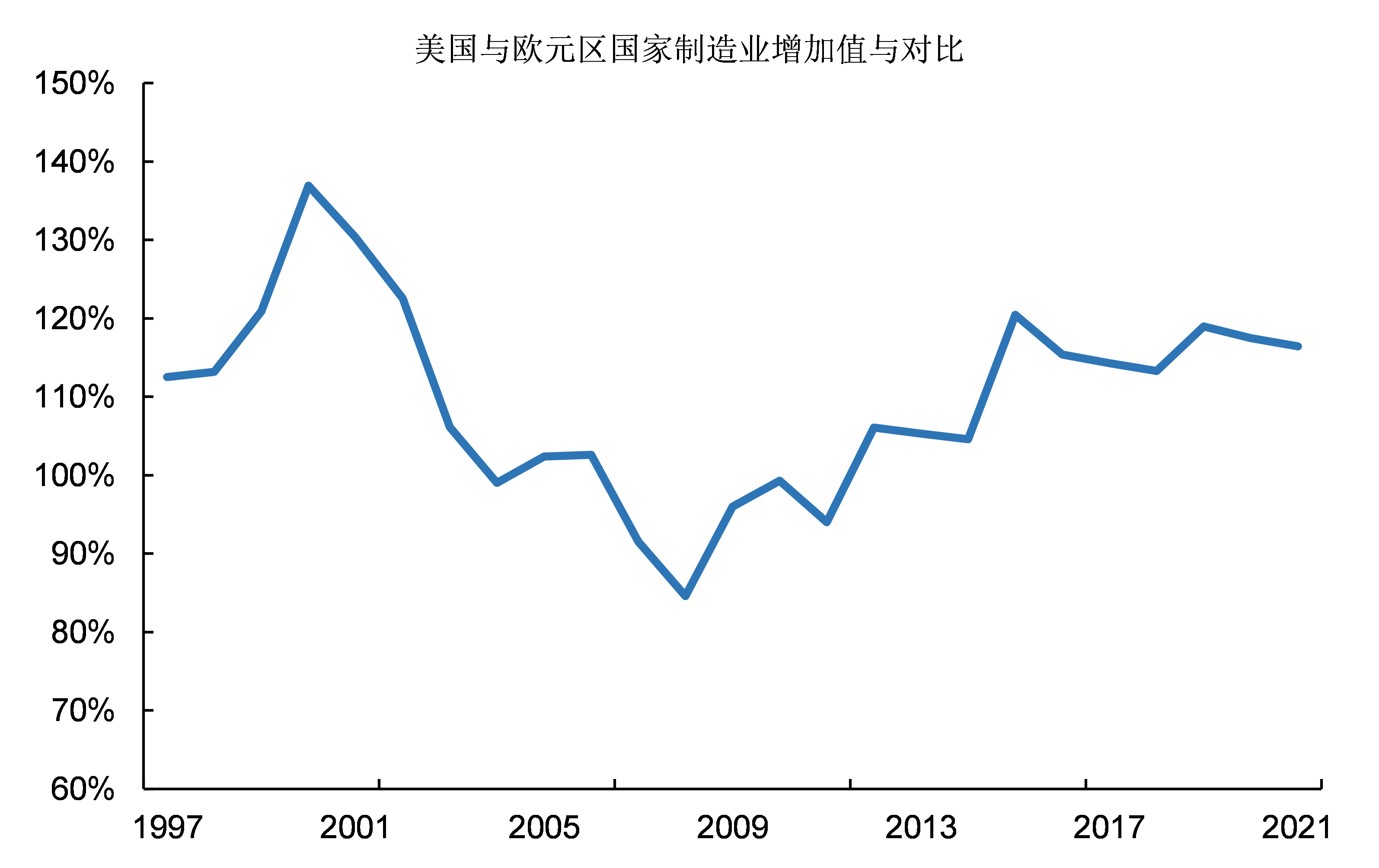 美國製造業的表現明顯好於歐洲國家,1997年美國製造業規模相當於歐元區國家的112.5%,到2021年這個比例上升至116.5%。