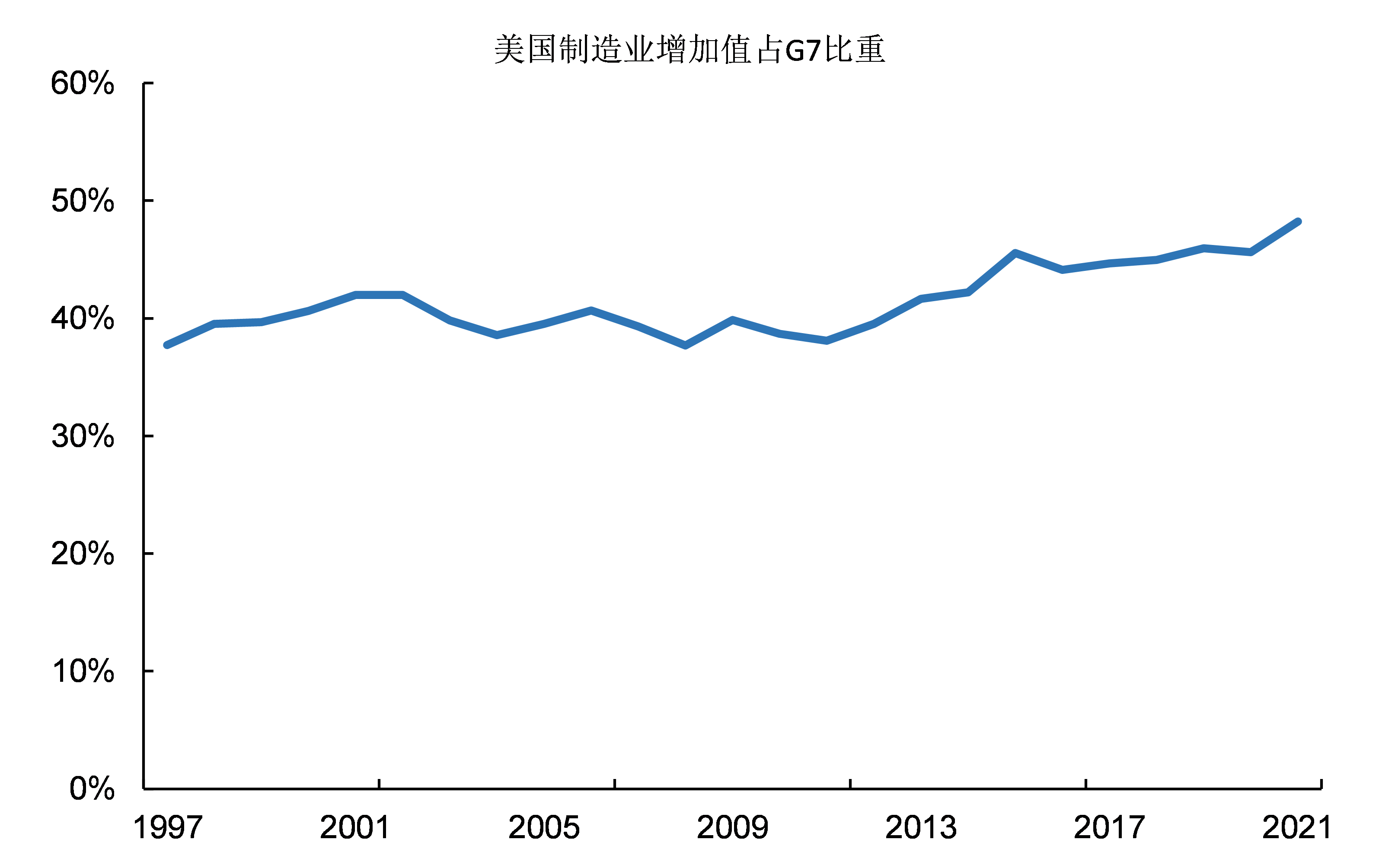 2000年美國製造業增加值在七國集團中的佔比只有40.6%,到2021年這個比例已經上升至48.2%。