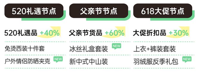 男裝商家需要踩準幾個關鍵波段:父親節的孝心經濟賽道、618大促的囤貨心智賽道。每個波段都需要定製“場景鈎子”——比如父親節用新中式中山裝喚醒文化認同,大促期反季羽絨服禮包沒準能激活消費者的逆向消費決策。