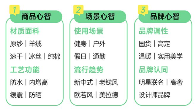 首先是商品心智,是以商品賣點為主的心智。比如面料技術、款式、風格、功效功能、原產地等商品關鍵詞。