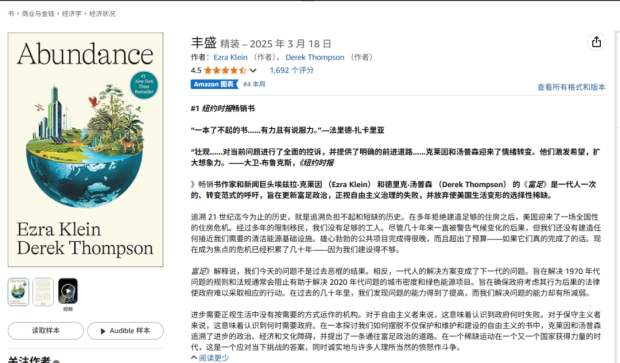 先説説“豐饒”這個詞是怎麼來的。今年年初在美國出版了一本書,書的名字就叫豐饒(Abundance,下圖中也有翻譯為“富足”和“豐盛”),這本的書的主要作者是埃茲拉克萊因(Ezra Klein),是個在美國頗有名氣的自由派評論員。本書大概的意思是,美國社會有很多問題真的是供應不足,美國人需要通過縮減審批,積極投資等方式,減少這些不足,才能達到美好的未來。