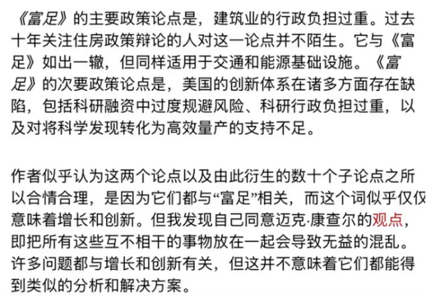 所以這本書為什麼在國內引發討論了呢?一個原因在於,**這本書被理解成了美國要學習中國路線。**坦白來説,這完全是誤讀,書中雖然對於中國的新能源政策之類表示認可,把這個作為美國應該積極投資新能源的論據之一,但整體內容依然是美國主流那一套,中國並非是這本書的重點。是一些看到了這本書的美國左翼人士嘲諷,説如果要達到豐饒,那中國做的比美國好多了,不管是太陽能還是電動車,中國都弄的很好,然後右翼也用這一套來嘲諷豐饒民主黨人。