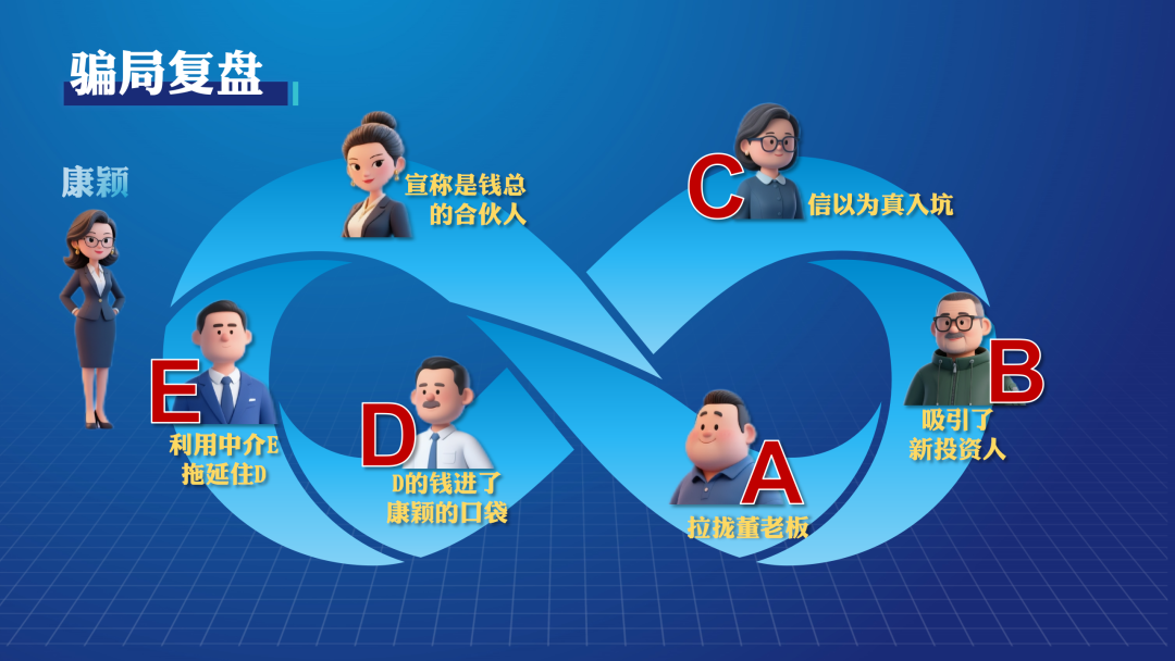 這個莫比烏斯環,形象地呈現了康穎的騙局。被害人依次關聯,從拉人入局成立公司、到吸引新投資人,資金不斷流入康穎手中,再通過中介拖延掩蓋真相。環環相扣,形成循環詐騙的閉合迴路,層層設套、持續斂財。