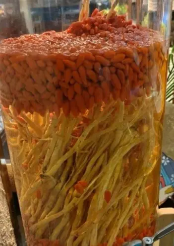 酒好了,就在家裏搞一個大缸,將藥材展現出來,讓所有人都看見自己的努力與財力。到了晚上,便一人一盅酒,一人一根腫脹的冬蟲夏草。