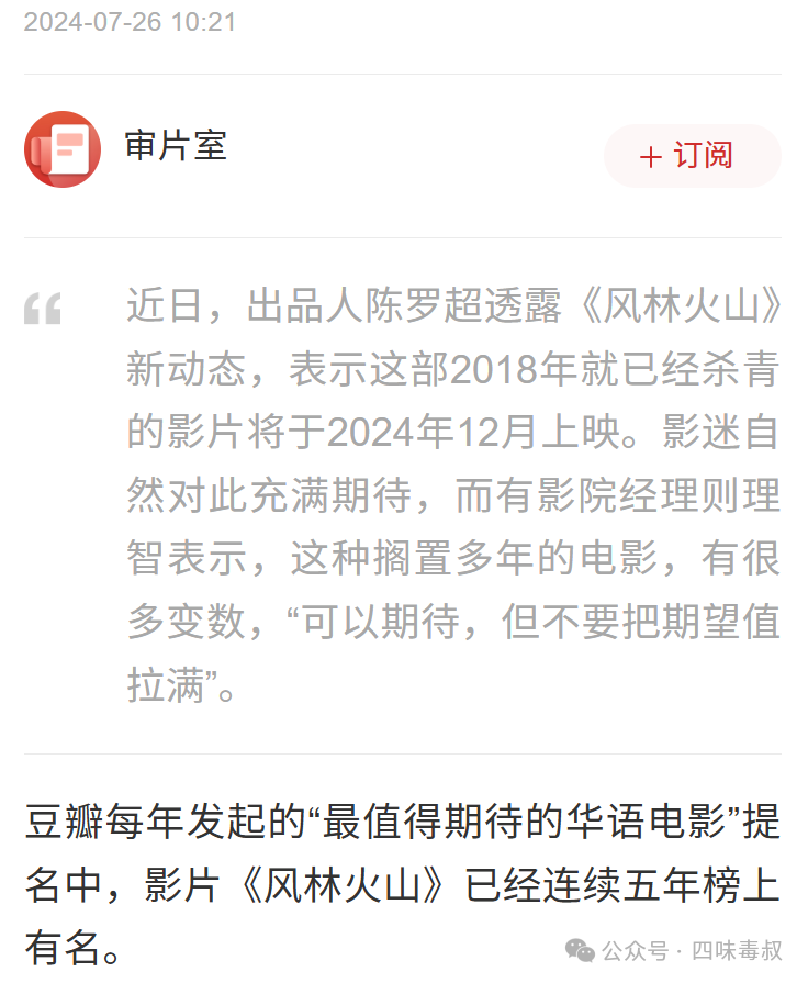 接着在2023年—2024年期間,關於《風林火山》可能上映的消息出現,只是相較於2018年的行情,其熱度大大降低。