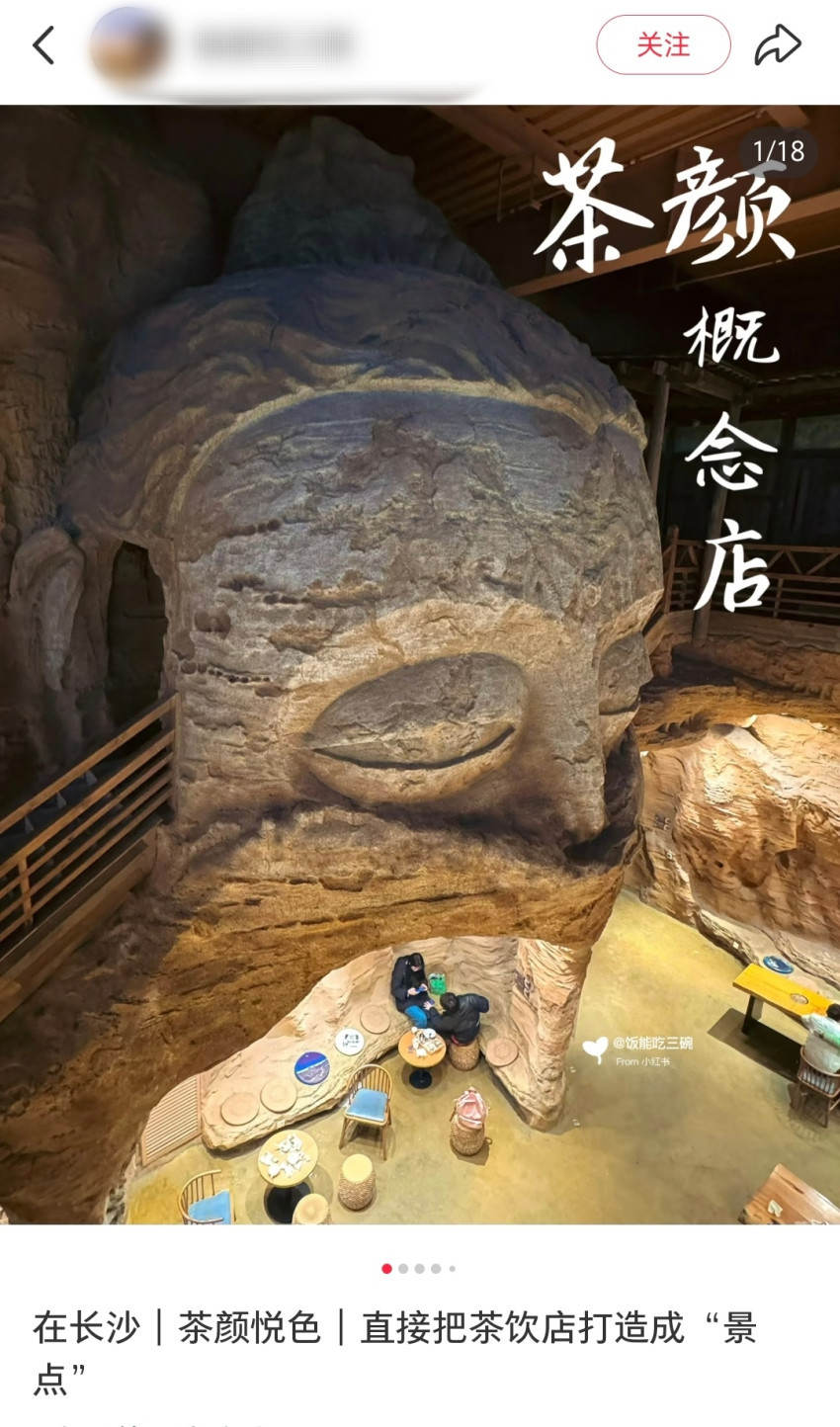 此前,茶顏悦色也將其位於長沙的多個概念店打造成“景點式”門店,據不完全統計,“茶顏悦色旗艦店”在小紅書的相關筆記高達3000多條,而幾乎每家店都被網友奉為“打卡聖地”。尤其是其開在步步高星城天地商場的樓蘭店,店內以石窟風格為特色,標誌性的大頭佛像盡顯古樸厚重,一樓的茶顏子品牌小神閒茶館還設有小閲讀區,免費提供書籍。