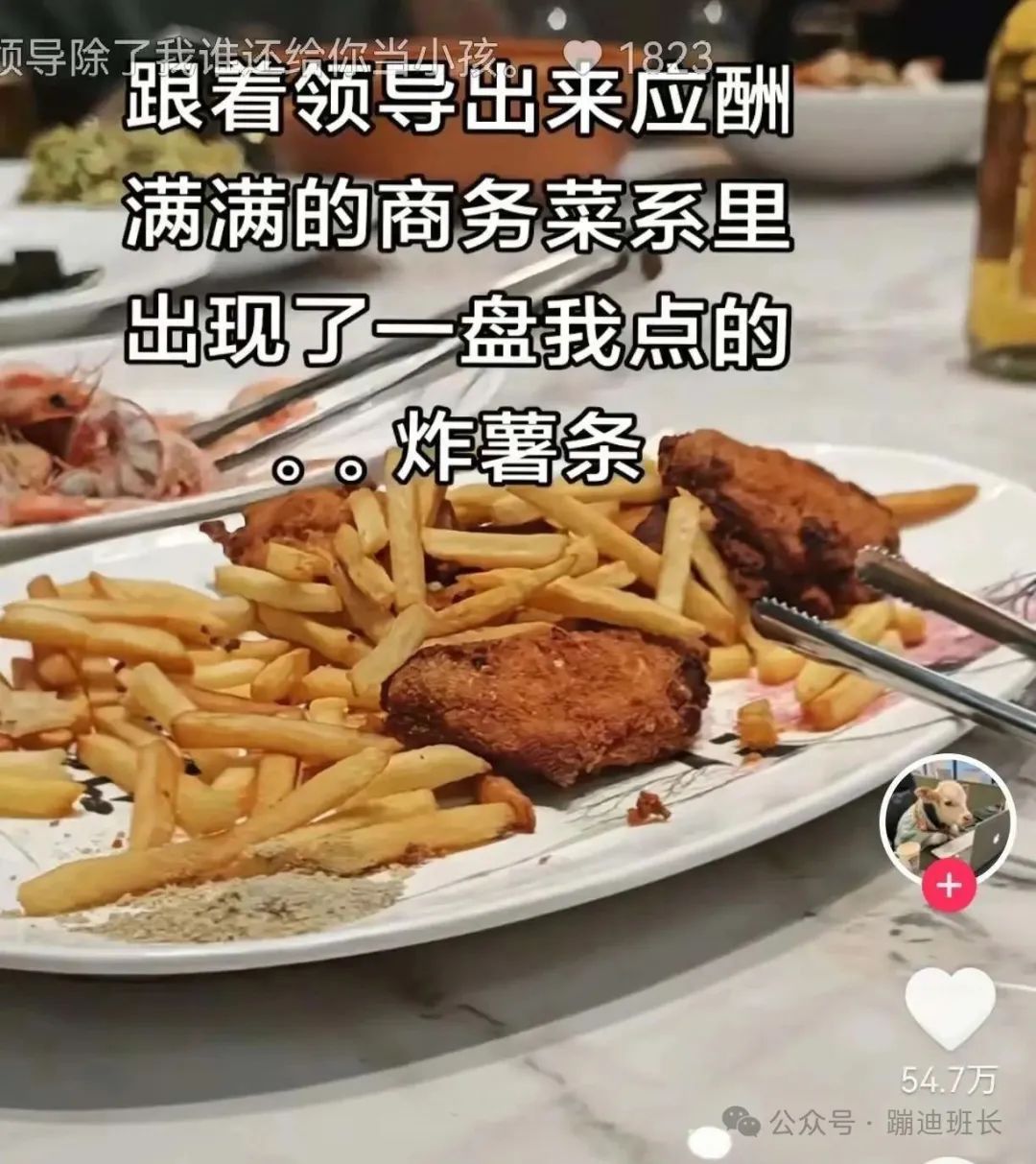 一盤煉乳小饅頭擺上包間大餐桌的轉盤,圖片上打着幾行字:跟着領導出來應酬,滿滿的商務菜裏出現了一盤我點的炸薯條…