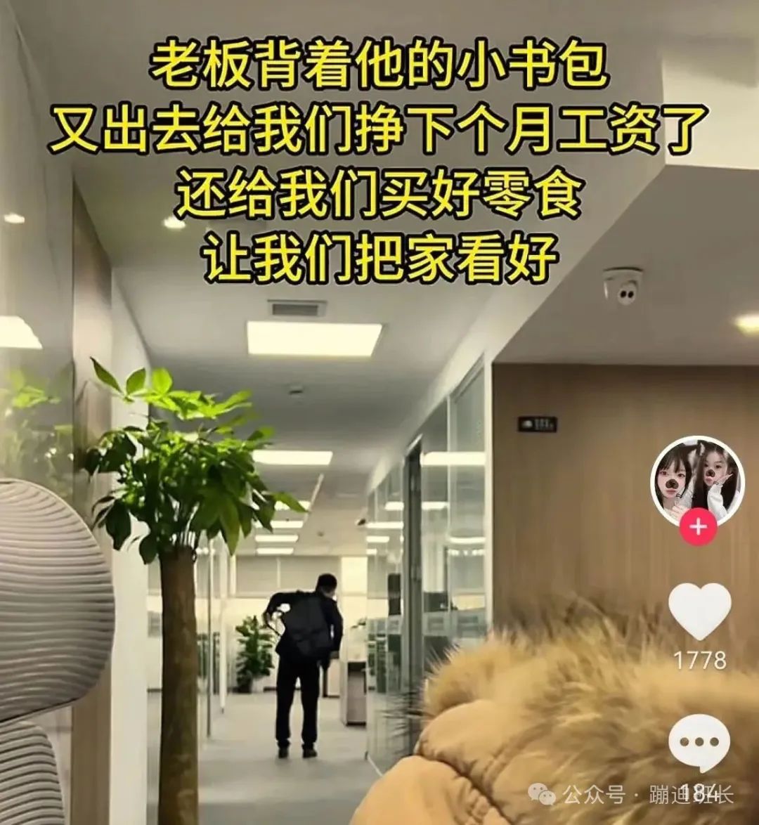 刷到一則視頻,視頻裏一名公司員工在自拍,老闆揹着書包準備離開,視頻裏寫着:領導給我們準備了小零食讓我們好好看家。