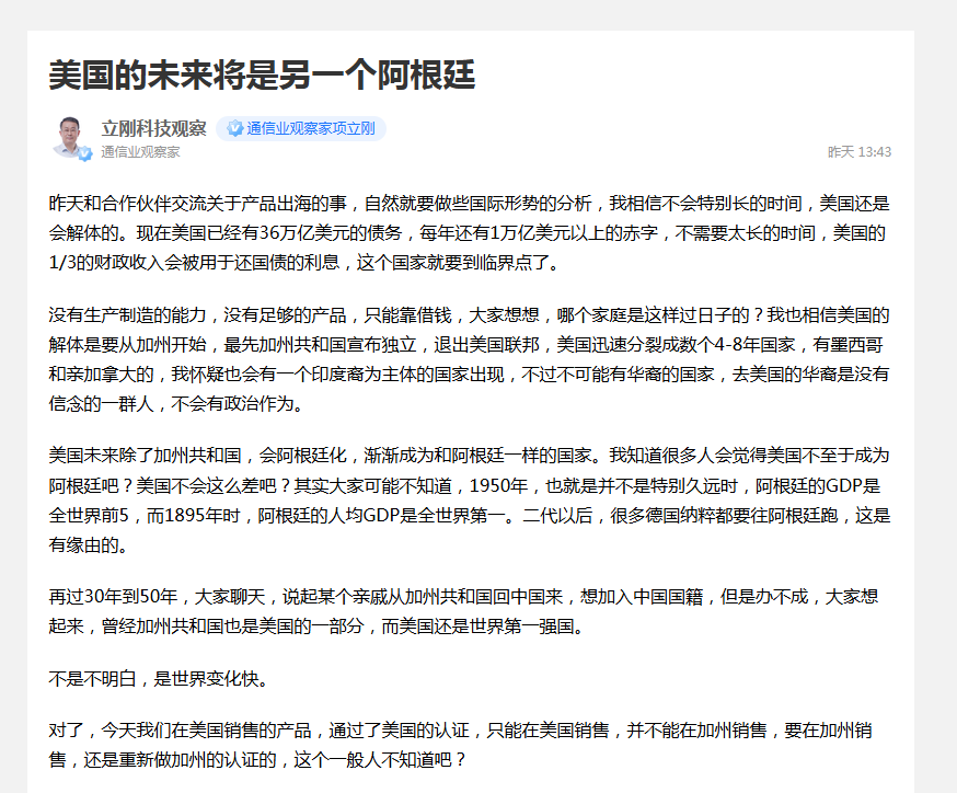 昨天下午,一向快人快語的項立剛在《觀察者網》發帖説“我相信不會特別長的時間,美國還是會解體的。現在美國已經有36萬億美元的債務,每年還有1萬億美元以上的赤字,不需要太長的時間,美國的1/3的財政收入會被用於還國債的利息,這個國家就要到臨界點了。沒有生產製造的能力,沒有足夠的產品,只能靠借錢,大家想想,哪個家庭是這樣過日子的?我也相信美國的解體是要從加州開始,最先加州共和國宣佈獨立,退出美國聯邦,美國迅速分裂成數個4-8年國家,有墨西哥和親加拿大的,我懷疑也會有一個印度裔為主體的國家出現”。我覺得,在美國這個世界唯一超級大國是否會在近期分裂這個重大戰略判斷上,項立剛的觀點包含了許多推測和假設,其論斷缺乏充分的現實依據和嚴謹的邏輯支撐,存在諸多不合理之處: