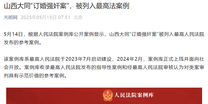 5月14日,山西大同“訂婚強姦案”被列入最高人民法院發佈的指導性案例或典型案例庫。