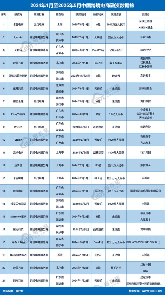 據網經社旗下電商大數據庫“電數寶”監測數據顯示,2024年1月至2025年4月,國內跨境電商領域共發生了21起投融資事件涉及的公司包括卡谷電商、LynxAI、艾姆詩、澳免跨境全球購、東昇跨境、趣佰全球、EasyYa易芽、WOOK、Stepin、雲喲電商、豆沙包、跨境魔方、域呈關免國際、Starmerx星商、星秀科技、綠森工業品、Qupital橋彼道、數美萬物、同舟互聯等。
