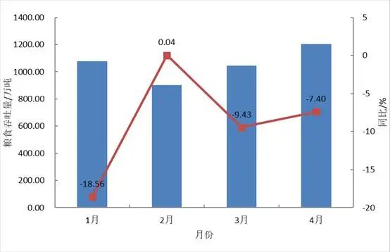 4月,中國港口協會統計的主要沿海內河港口企業累計完成糧食吞吐量1670.28萬噸,同比下降3.1%,其中累計完成外貿糧食吞吐量867.59萬噸,同比下降14.3%。2025年1-4月,主要港口企業累計完成糧食吞吐量5829.67萬噸,同比下降6.6%,其中累計完成外貿糧食吞吐量2497.63萬噸,同比下降29.5%。4月,大連港集團、營口港務集團、天津港集團、煙台港集團、青島港集團、日照港集團、連雲港港口控股集團、寧波舟山港股份、廣州港集團、北部灣港股份等主要糧食接卸港口企業累計完成糧食吞吐量1203.20萬噸,同比下降7.40%。2025年1-4月,上述主要糧食接卸港口企業累計完成糧食吞吐量4227.88萬噸,同比下降9.62%。2025年主要糧食接卸港口企業月度糧食吞吐量及同比增速見圖5。