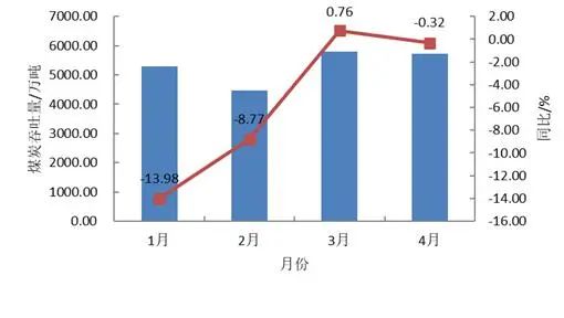 4月原煤生產穩定增長,電力生產平穩增長,進口煤炭同比下降明顯。根據國家統計局的數據,4月,規上工業原煤產量3.9億噸,同比增長3.8% ;1-4月我國規上工業原煤產量15.8億噸,同比增長6.6%。4月規上工業發電量7111億千瓦時,同比增長0.9%,其中規上工業火電降幅持平,同比下降2.3%;1-4月,規上工業發電量29840億千瓦時,同比增長0.1%。據海關總署統計數據,4月煤炭進口量為3782.5萬噸,同比下降16.41% ;1-4月,累計進口煤炭15267.10萬噸,同比下降5.3%。