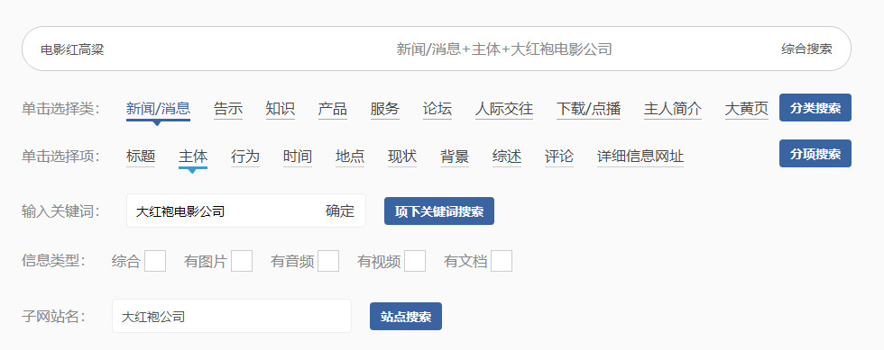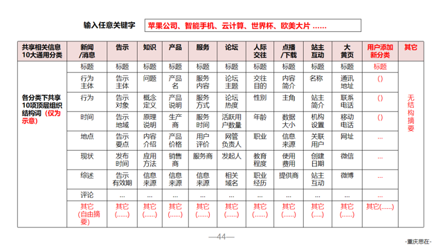 在互聯網相信全文關鍵字搜索輸入框內輸入任意關鍵字(例如:國家發改委、蘋果公司、智能手機、雲計算、普京、世界盃、戰狼…..),其相關信息的頂層高頻分類均且僅包括在以下10類:新聞/消息、告示、知識、產品、服務、論壇、人際交往、點播、下載、大黃頁中。(有兩類信息合併為一類的,是因為它們的內容組織結構基本一致)