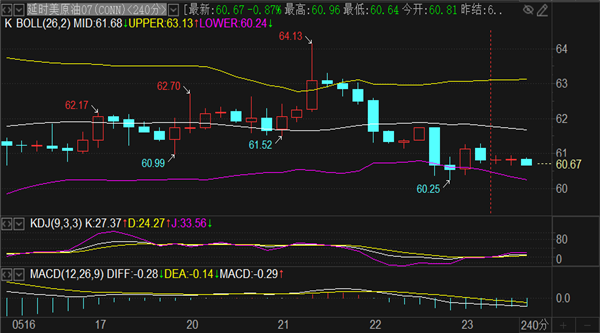 原油即時行情分析:原油漲跌波動緩慢,1小時趨勢線阻力從昨天61.5下移到61.2位置,而低位日線SAR指標從59.1上移到59.4,這個範圍就是今天的温和震盪區間,無論行情向哪邊突破我預計都會有延續行情出現。