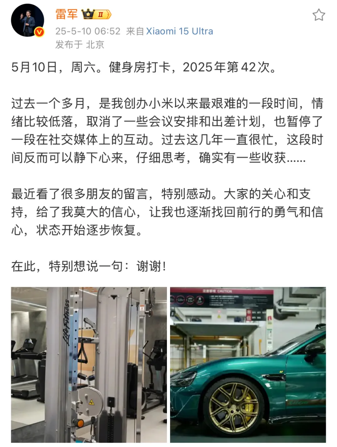 雷軍曾坦言,過去一個多月,情緒比較低落,取消了一些會議安排和出差計劃,也暫停了一段在社交媒體上的互動。