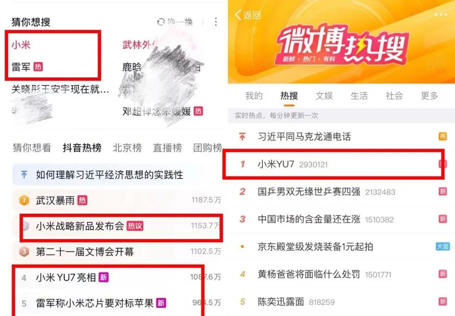 毫無懸念,當雷軍攜長達兩個多小時的發佈會 “迴歸” 時,微博、抖音等各大熱搜平台瞬間被強勢霸屏,滿屏盡是“YU7”與“雷軍”的相關話題。