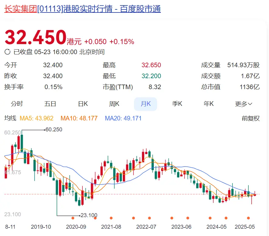 5月22日,長實集團股價跌1.67%,23日微漲0.15%。