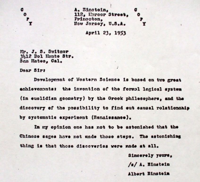 1953年,有一個叫斯威策(J. E. Switzer)的人寫信給愛因斯坦,問他怎麼看待中國古代的科學。愛因斯坦的回信如下: