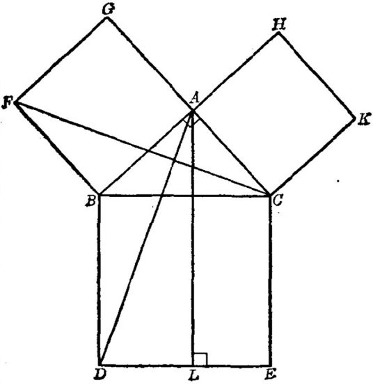 但是有一個例外,就是古希臘。古希臘出了一批了不起的數學家,他們的成果集中反映在歐幾里得的**《幾何原本》**裏。《幾何原本》總共有13篇,一開頭就寫出了23個定義,定義了點、線、面、圓、平行線等概念,然後寫出了5條公理和5條公設。然後基於這些定義和公理,歐幾里得就開始推導定理,一共推出了467個定理。勾股定理是《幾何原本》第一篇的第47個定理,證明用到的圖如下。此書的主體就是這些定理,以及對它們的證明。