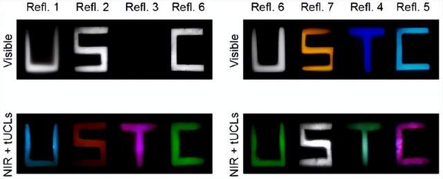 各種圖形(不同反射波譜的反射鏡片模擬)通過tUCLs內置的可穿戴式框架眼鏡系統在可見光和近紅外光照射下的色彩顯示