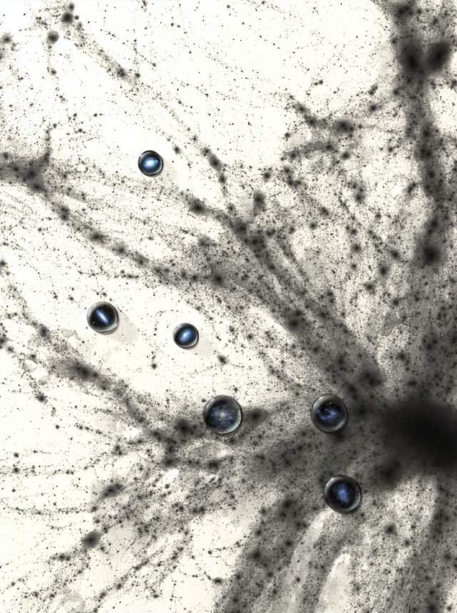 宇宙大尺度暗物質分佈藝術圖。水珠中呈現不同環境下的矮星系圖像,展示了宇宙大尺度結構與小尺度星系形成之間的複雜關聯。