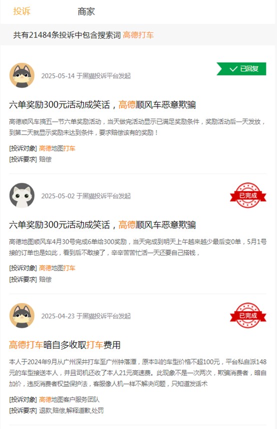據相關數據顯示,在消費調解平台黑貓投訴上,以“高德地圖”為關鍵詞的相關投訴多達38738條,其中“高德打車”的投訴量也達到了21484條。這3.8萬條投訴,如同一面鏡子,映照出高德打車背後的服務亂象。