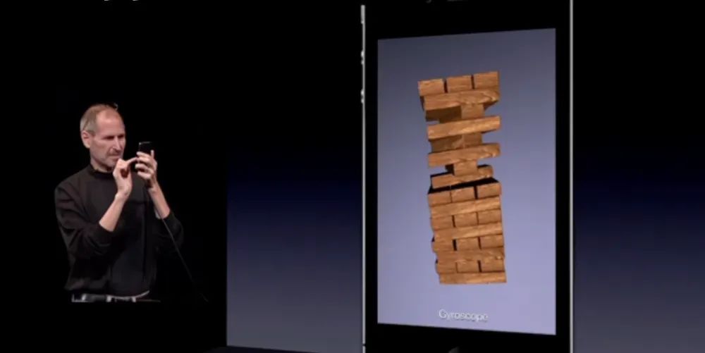 喬布斯在發佈會上,只是轉動手機,遊戲中的木塊堆也跟相應跟着轉向、搖擺,這讓當時的人們大開眼界。