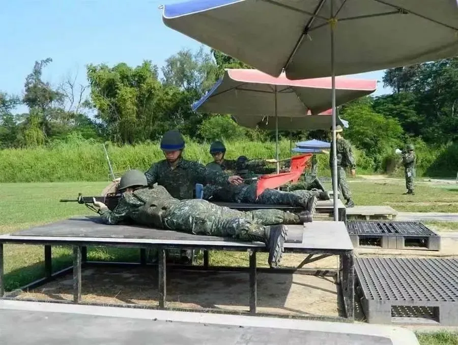 台軍士兵在太陽傘下訓練射擊 被台媒諷刺為“草莓兵”