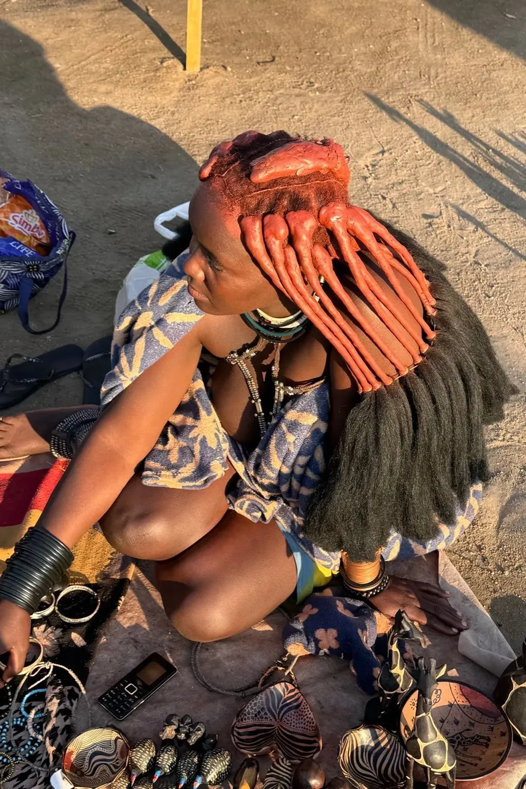 歸途中很罕見地在小集市上看到兩個辛巴族婦女,頭髮上梳着髮髻塗着厚厚的紅泥巴,裸露着的上身也塗滿紅泥,當時感到非常驚奇也有些震撼。