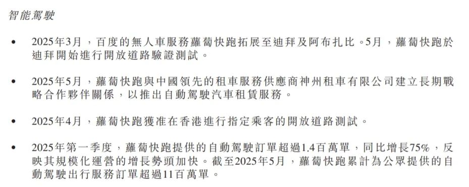 智能雲之外,AI也驅動着百度的另一個商業引擎——蘿蔔快跑。財報顯示,一季度蘿蔔快跑的自動駕駛訂單超過140萬單,同比增長75%。