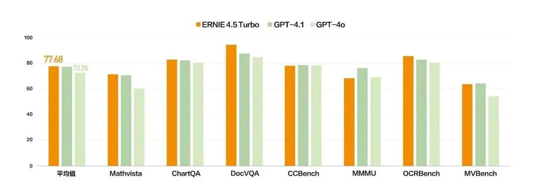 比如今年4月,在Create大會上,百度發佈了兩款新模型:文心大模型4.5 Turbo、文心大模型X1 Turbo。性能上,在多個基準測試集中,4.5 Turbo的多模態能力優於GPT4o。