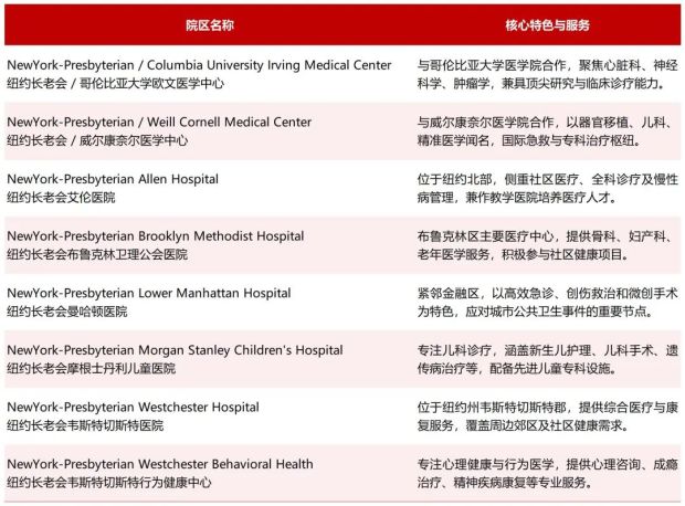 其中,紐約醫院建立於1771年,是康奈爾大學醫學院的附屬醫院;長老會醫院建立於1868年,是哥倫比亞大學醫學院的附屬醫院。