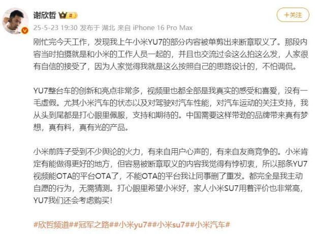 對於Shin的問答對話視頻被傳開,謝欣哲發文稱,發現小米YU7的部分內容被單剪出來斷章取義了。
