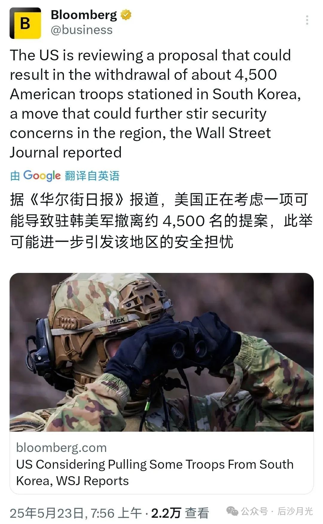 5月23日,《華爾街日報》報道,白宮正在考慮撤出4500名駐韓美軍,佔總數六分之一左右。