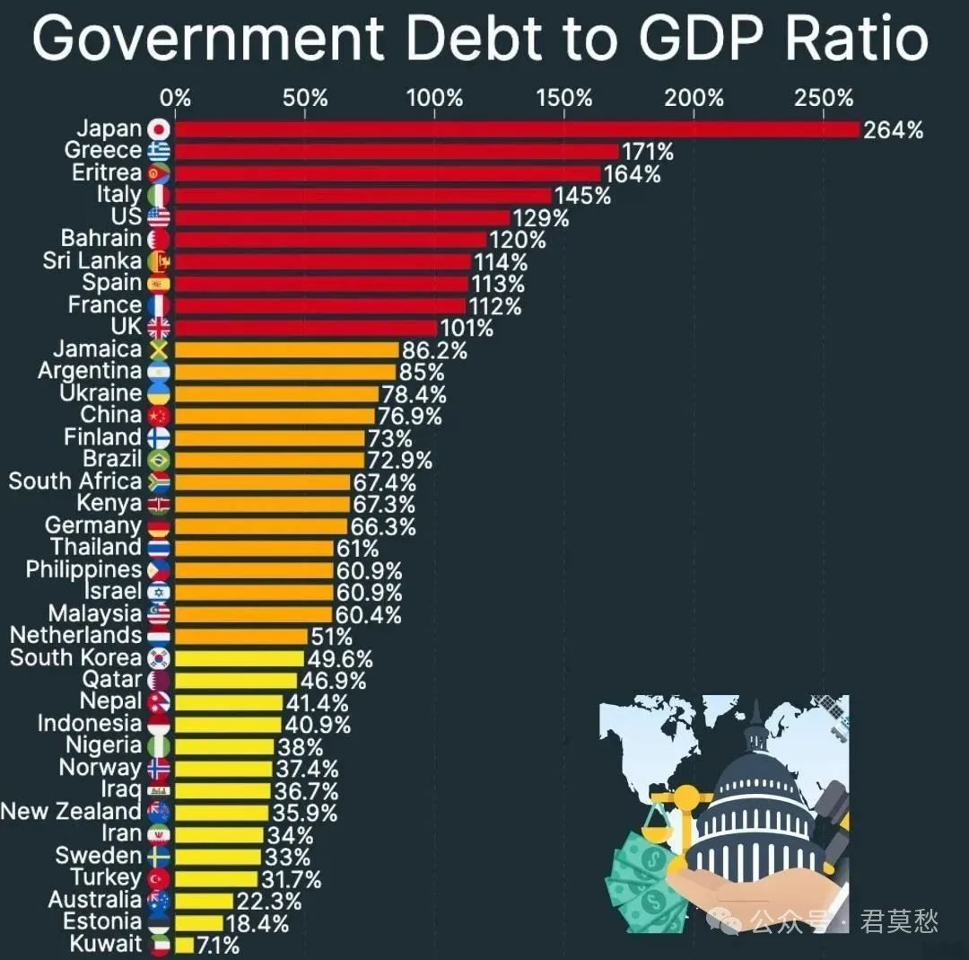 目前日本政府的債務佔GDP的比例已經達到了驚人的264%,世界第一,遠高於美國的129%、中國的76.9%。