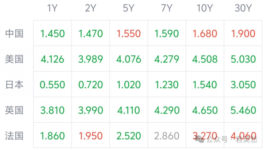 大家看下面一個圖,這個圖就是不同國家政府發行國債的收益率。比如,你現在在債券市場上購買中國政府發行的1年期的國債,那麼收益率是1.45%;5年期的國債收益率是1.55%;10年期的國債收益率是1.68%;30年期國債的收益率是1.9%……